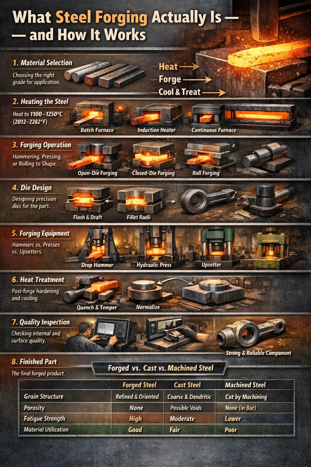 La réponse courte à la façon dont vous forgez l'acier : chauffez la pièce à la bonne température de forgeage, placez-la sous un marteau ou une presse, appliquez une force contrôlée pour la façonner selon la géométrie souhaitée, puis suivez un cycle de refroidissement ou de traitement thermique prescrit pour verrouiller les propriétés mécaniques. Chaque variable (température, force, géométrie de la matrice, taux de déformation et vitesse de refroidissement) détermine la qualité finale de la pièce.