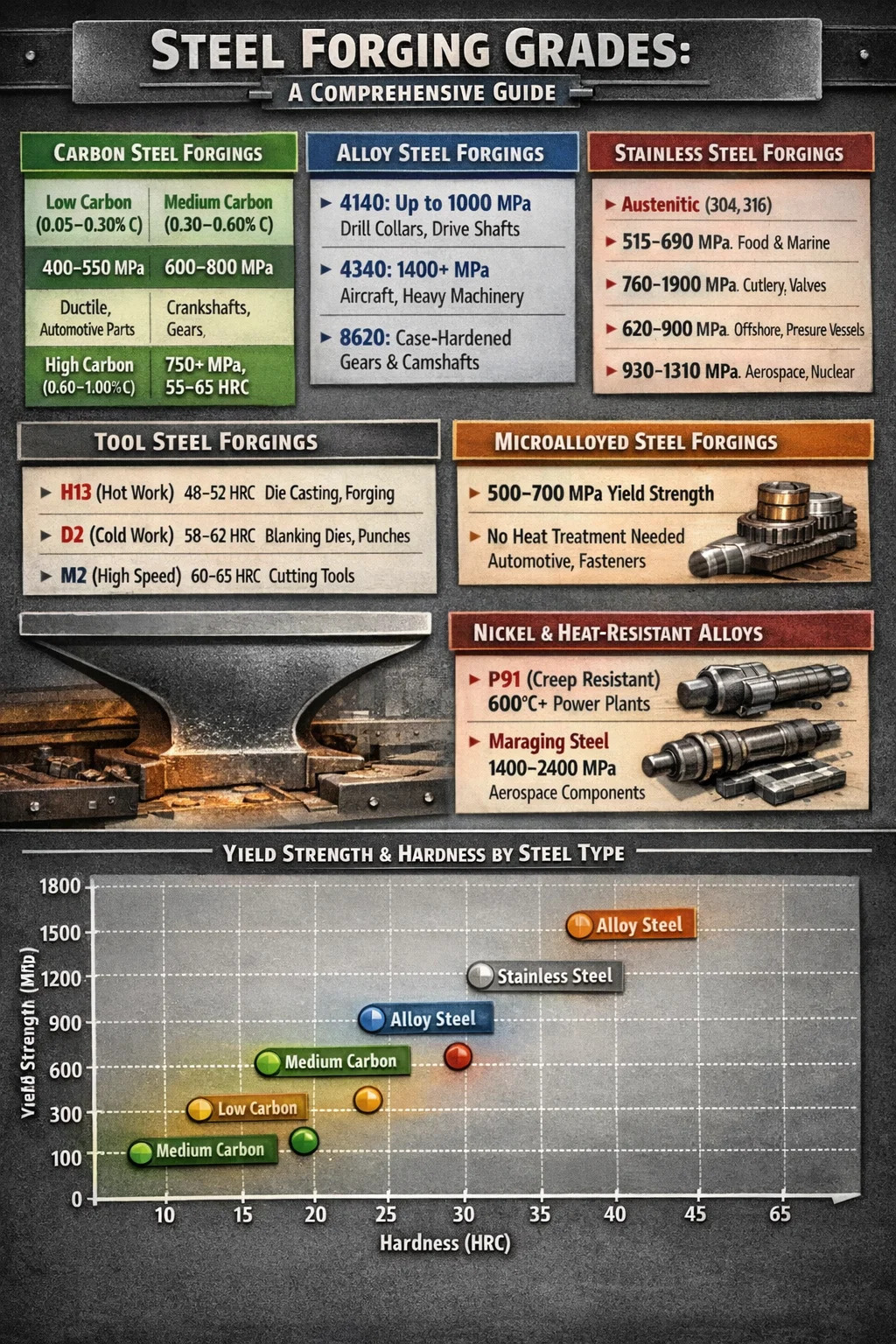 Forgeage de l'acier est l’un des procédés de travail des métaux les plus anciens et les plus fiables du secteur manufacturier. La réponse courte aux types d’acier forgé existants : acier au carbone, acier allié, acier inoxydable, acier à outils et acier microallié sont les cinq principales catégories utilisées dans le forgeage industriel de l’acier. Chaque type répond à des exigences mécaniques et environnementales distinctes, et choisir le mauvais peut entraîner une défaillance prématurée, des risques pour la sécurité ou des dépassements de coûts inutiles.
