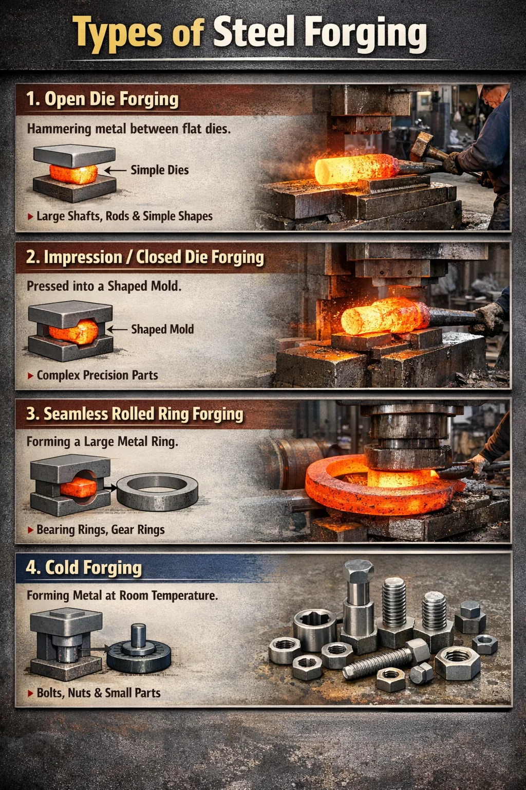 Dans le domaine de la transformation des métaux, il existe de nombreux procédés de forgeage différents. Selon la méthode de classification la plus courante, forgeage de l'acier peuvent généralement être divisés en quatre catégories suivantes :