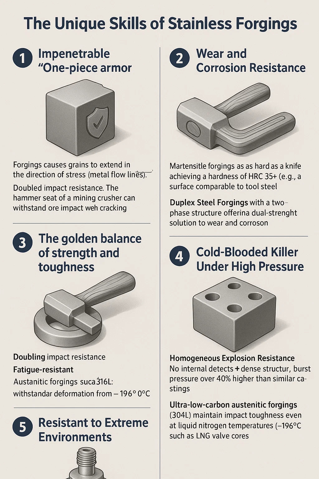 Incassable : le forgeage compacte soigneusement les pores et le retrait, ne laissant aucune place aux milieux corrosifs : les pièces moulées sont comme des éponges, les pièces forgées sont comme des lingots solides.