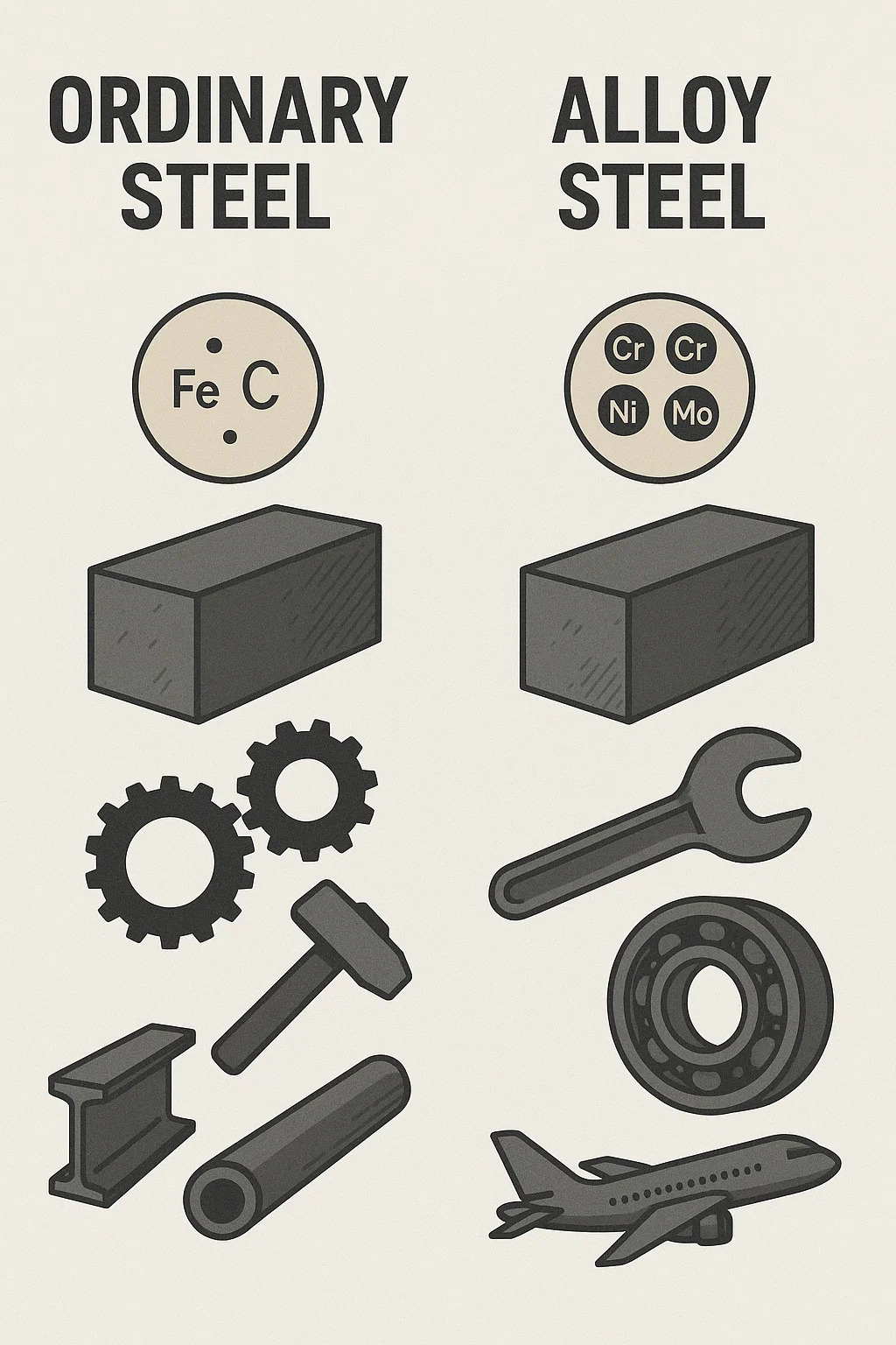 | Composition primaire | Fer Carbone (avec un minimum d'impuretés) | Fer Carbone Éléments d'alliage ajoutés de manière significative (par exemple, chrome, nickel, molybdène) |