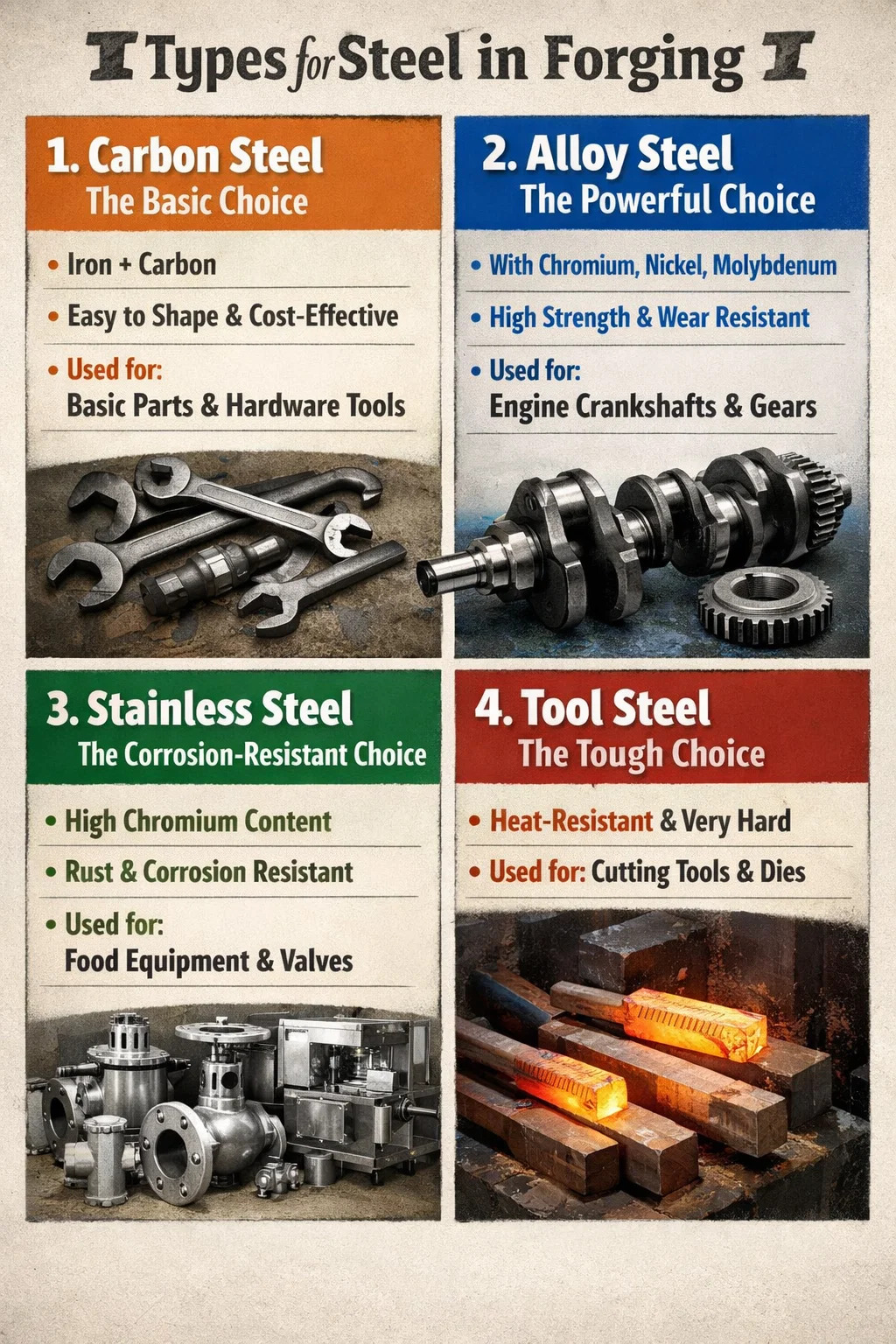 Dans la production industrielle actuelle, tous les aciers ne se prêtent pas au « chauffage et au martelage ». Pour garantir que les pièces obtenues sont à la fois solides et durables, forgeage de l'acier utilise généralement les types d'acier courants suivants, en fonction de l'application :