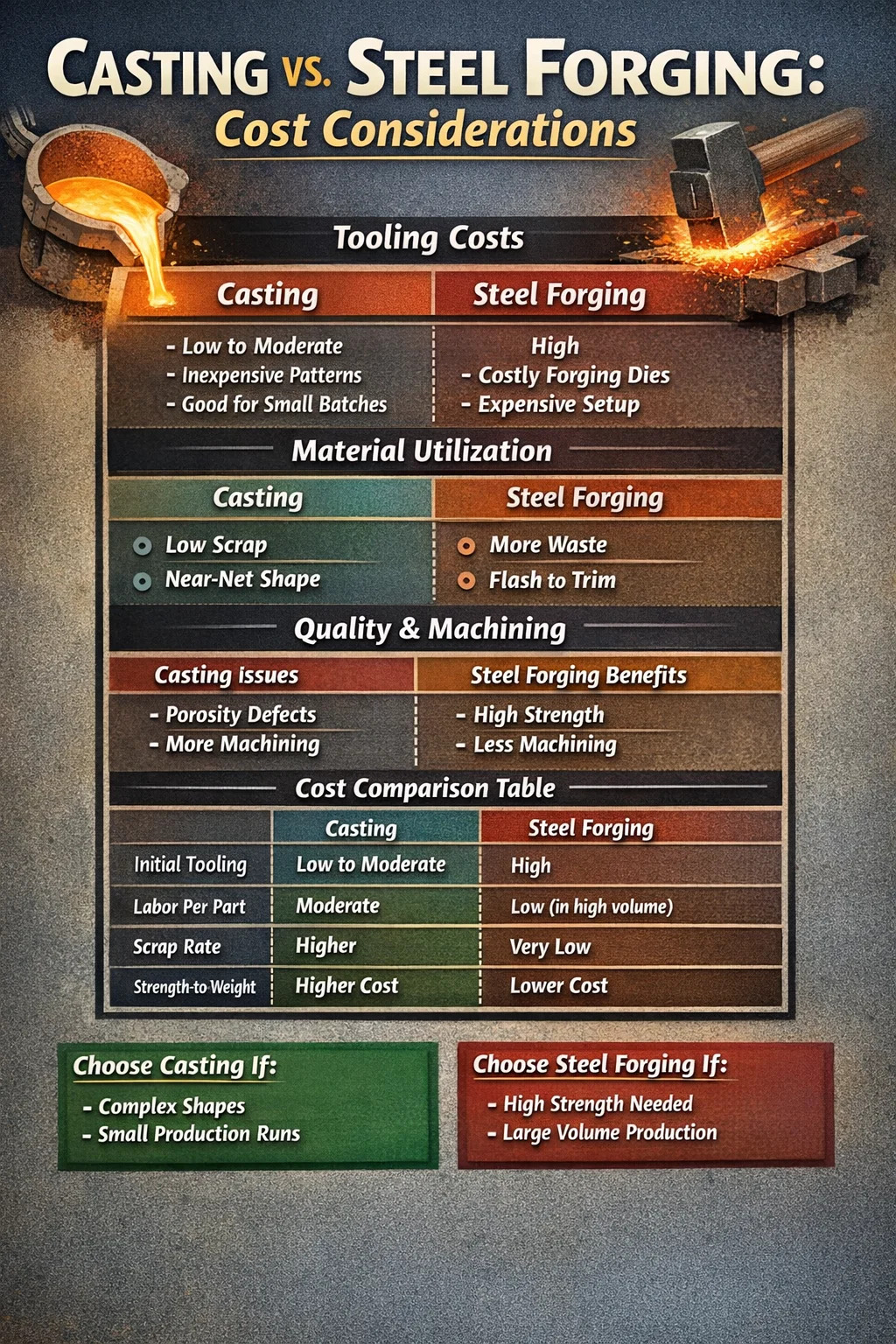 Le moulage permet une production « proche de la forme nette ». Étant donné que le métal liquide remplit chaque crevasse d’un moule, il y a très peu de déchets. Cela rend le moulage moins cher lors de l'utilisation d'alliages coûteux. En revanche, forgeage de l'acier Il en résulte souvent un « flash » – un excès de métal expulsé entre les matrices – qui doit être découpé et recyclé. Cependant, pour l’acier au carbone standard, le coût de ces déchets est souvent compensé par la vitesse supérieure des marteaux de forge.